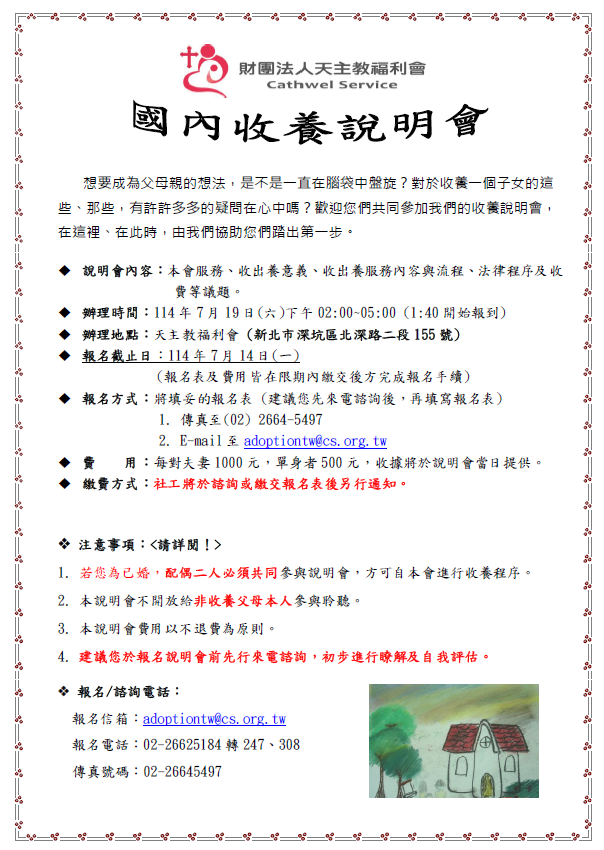 大家好,本中心協助轉發天主教福利會將於114年7月19日舉辦收養人說明會哦