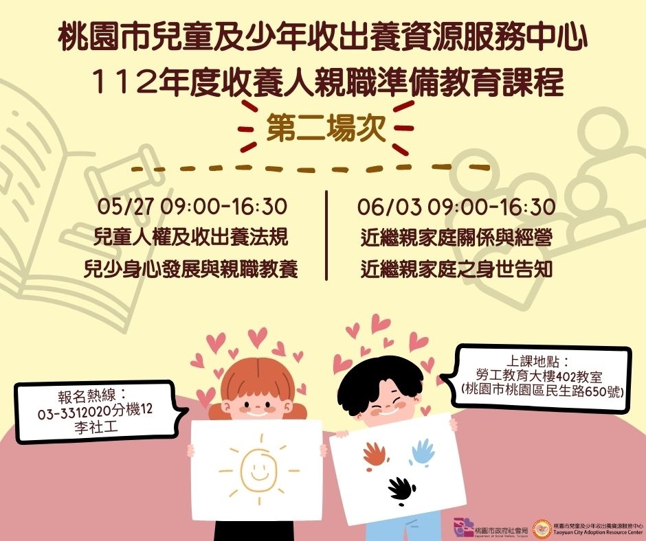 112年第二場收養人親職準備教育訓練課程資訊來囉~確定於5/27及6/3辦理四個主題課程,課程地點位於桃園勞工教育大樓,歡迎有需要或有興趣的家長及民眾報名參與。