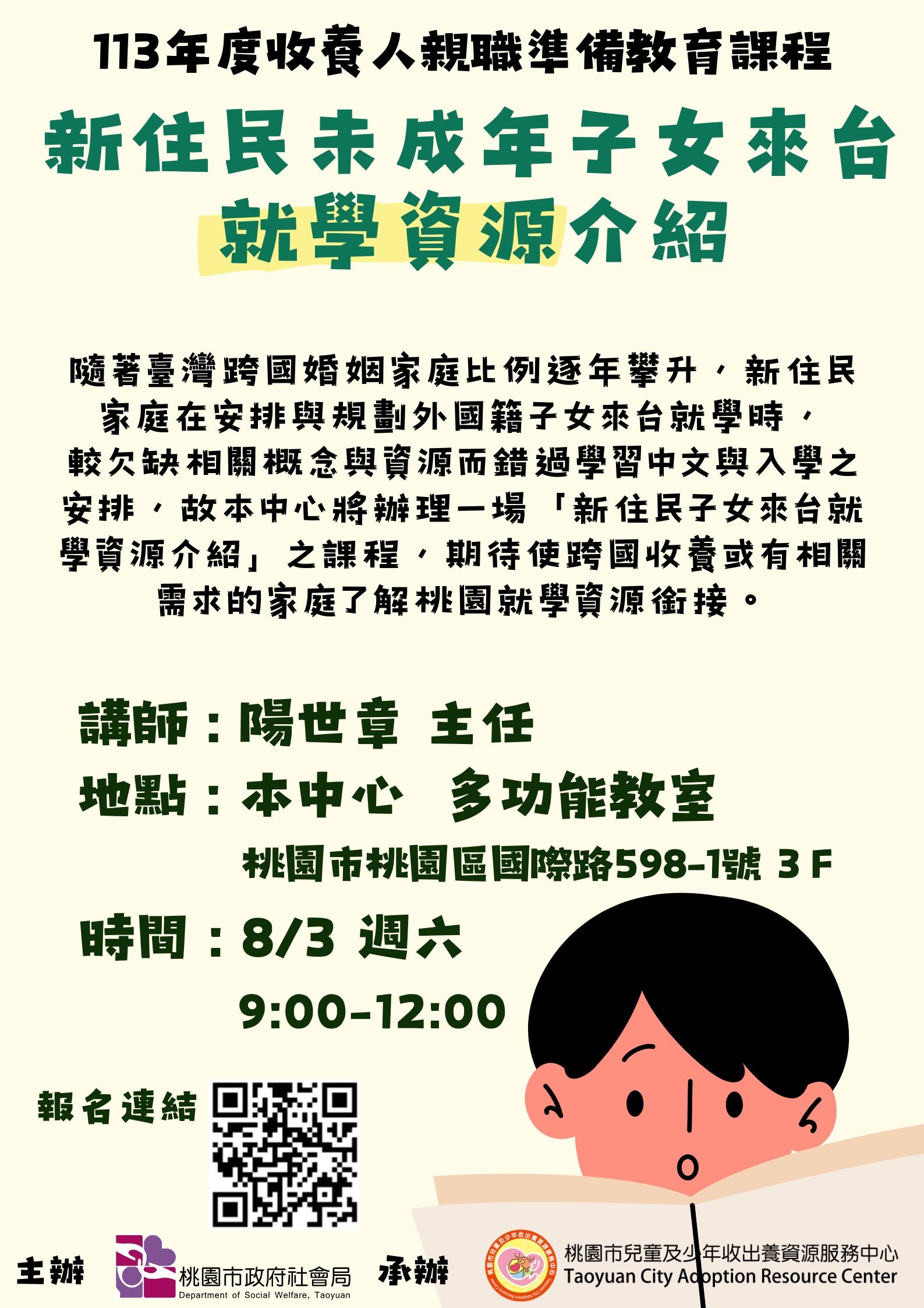 使跨國收養或有相關需求之家庭更了解桃園就學資源,歡迎有需要或有興趣的新住民家庭趕快報名參加!
