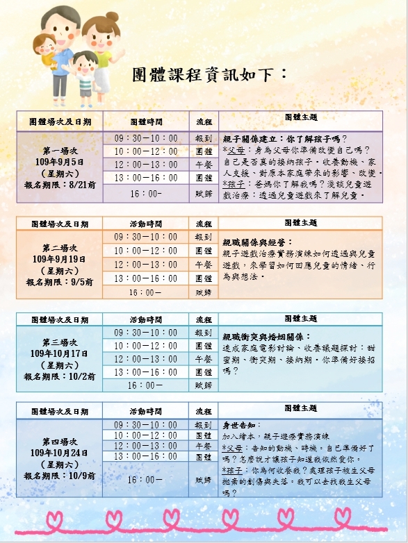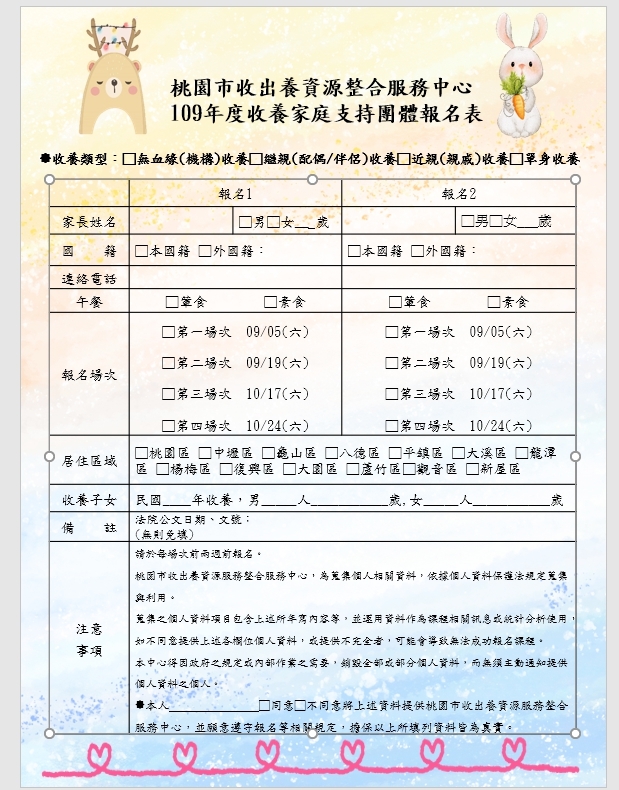 5.考量授課方式及效果,每場名額有限,依報名順序及設籍或居住地為桃園市收養家庭為優先。