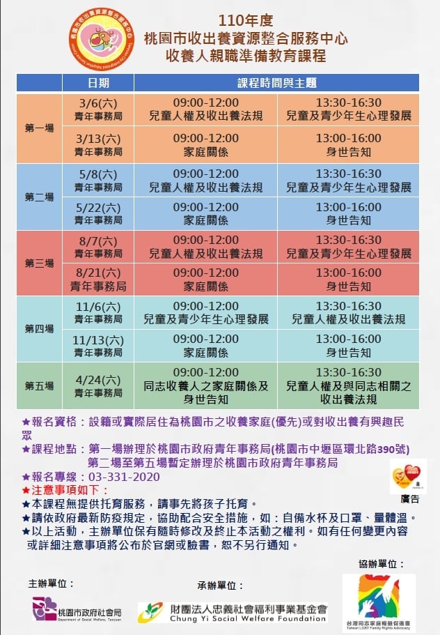 【110年收養人親職準備教育課程】本中心課程最新上課資訊出爐嘍!
